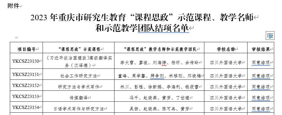近日,重庆市教育委员会发布了《重庆市研究生教育“课程思政”示范项目结项名单的通知》(渝教研函〔2025〕11号),正式公布了结项验收结果。我校于2023年立项的五项重庆市研究生教育“课程思政”示范项目全部顺利通过验收,标志着我校在深化研究生课程教学改革、落实立德树人根本任务方面取得了又一重要阶段性成果。