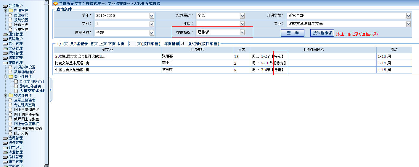 6.排课地点安排方法,排课情况选择已排课,点击课程时间旁边的“待定”进入教室选择页面。如下图: