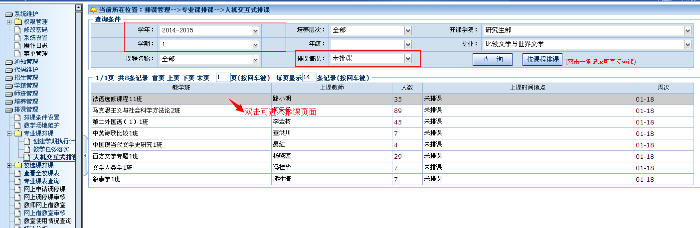 1.在查询条件中输入正确的学年、学期。2.MTI的课程请选择翻译学院,其他学术型课程请选择研究生部。3.排课情况选择未排课.点击查询。4.双击课程名称进入排课页面。如图: