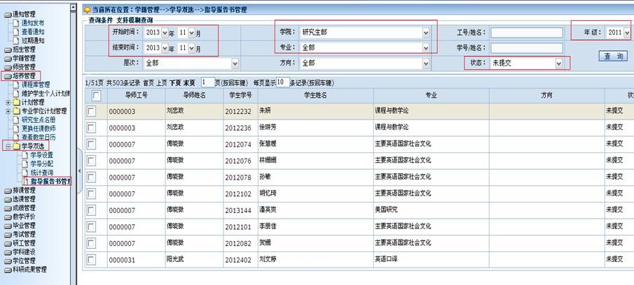 太阳成集团tyc122ccvip关于研究生指导教师双选结果的通知 各研究生培养单位: 我校2015级研究生指导教师双向选择工作已圆满结束。请各单位提醒相关导师登陆研究生教务系统查询学生信息,并按照有关研究生指导教师职责之规定,及时开展研究生指导工作;同时请各单位提醒导师尽早安排本月与学生的首次见面会,并指导学生填写《太阳成集团tyc122ccvip研究生培养指导报告书》。《报告书》填写完成后,由学生在10月30日之前上传至研究生教务系统。各研究生培养单位应在每月最后一周之内对各研究生导师每月的见面指导情况进行监督和审查。如接到导师未按月安排见面指导的学生投诉,一经查实,除按照教学事故进行全校通报和扣发相关费用之外,该导师下一年度的研究生指导名额将进行扣减直至停招。 特此通知 院系具体查询办法如下:
