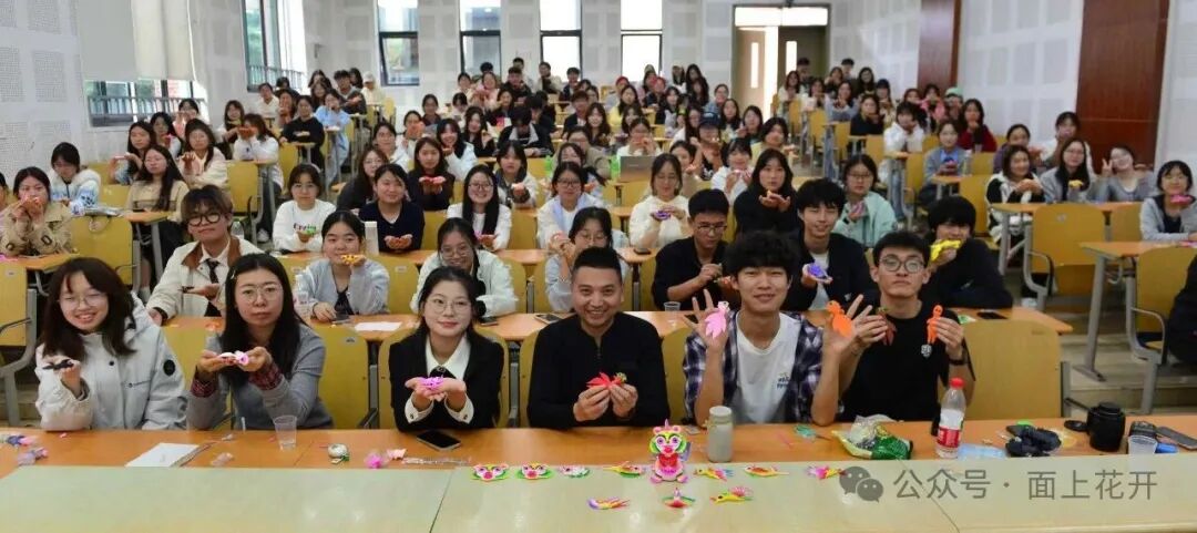 姜攀从女娲神话讲起,阐释面花在中国礼俗中的情感内涵,并分享其从外婆手中传承技艺、探索传统与现代融合的历程。他强调:“真正的传承是在尊重本源中实现创造性转化。”同学们在互动环节使用环保材料制作“面花鱼”,并凭借语言优势进行中英双语解说,展现了非遗传播的多元路径。