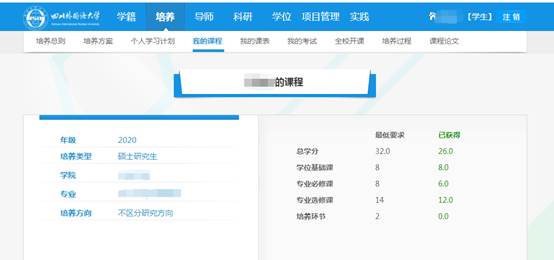 2020级今年将毕业研究生请登录研究生新教务系统,在“培养—我的课程”页面,查询自己的学分和成绩是否满足以上要求。