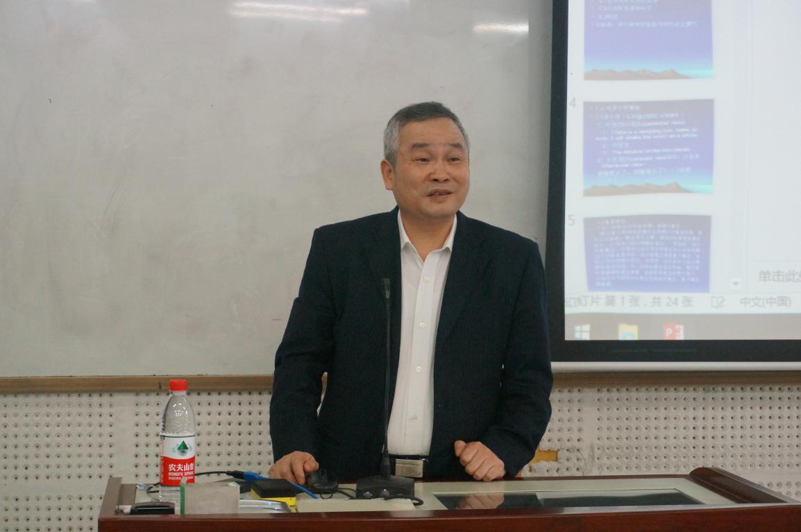 讲座伊始,廖教授从语言观(言语生成方面)、认知语言学的重要理论、语言认知研究的内涵和语言认知研究的方法等四个方面面勾勒出认知语言学要略。接着,他对具有代表性的实例进行分析,其中包括对复合词和名词性短语的分析、对动词性短语和句子的分析以及对构式的分析,揭示了了认知语言学在言语生成研究中的应用。最后,廖教师讲述了语言研究的原则与技巧——语言学作为一门人文学科,实证研究可作为工具,最关键还是在于内省与思辨,并指出进行学位论文撰写时,要坚持多视角、多维度,且选题规模不可过于细致入微,以保证研究的可持续性。