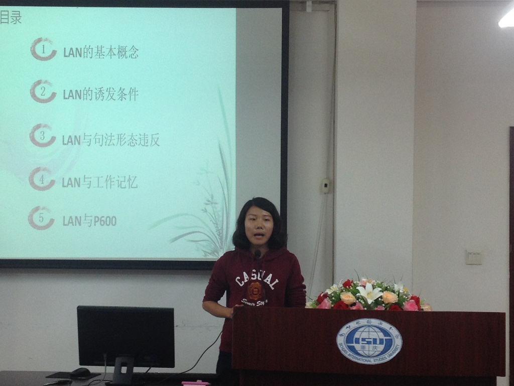 2016年4月7日晚上7:00,川外学坛“学子之星”学术讨论会在博文楼六楼报告厅如期举行。本次讨论的主题是“认知加工中的脑电成分之ELAN与LAN”,主讲人为2014级研究生潘雪瑶同学和郑贵兰同学。讨论会由荣婷婷同学主持,姜孟教授出席,此外各年级研究生参加了本次学坛活动。