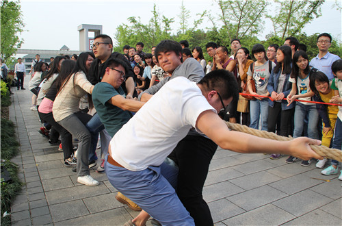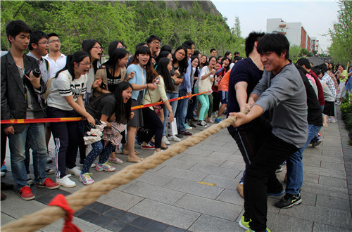 2015年4月14日,在太阳成集团tyc122ccvip西区景观大道上,春季运动会拔河比赛进入巅峰对决阶段。在之前的几场比赛中,卫冕冠军研院队在队员团结一心和密切配合下,气势如虹,以压倒性优势顺利晋级总决赛。而在这场卫冕之战中研院拔河队对阵的是实力亦不俗,一路过关斩将脱颖而出的国商14级拔河队,这也为这场紫禁之巅双雄对决平添了不少看点和未知数。
