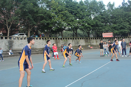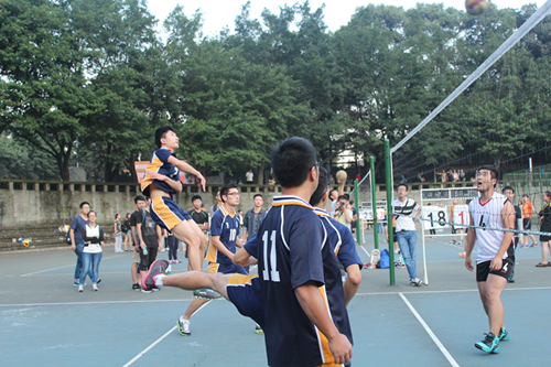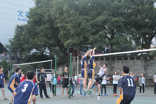 10月20日下午,我校2015年学生排球联赛在山下排球场展开激烈角逐。首场比赛由研究生对阵新闻传播学院。天公作美,天朗气清,阳光柔和,队员们信心百倍,一早就来场地热身。啦啦队也早早到场助威,加油呐喊。