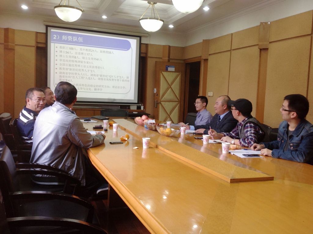11月8日下午赴湖南大学外国语学院进行调研。湖南大学外国语学院院长刘正光、副院长朱健平亲自接待。朱健平详细介绍了学院的总体情况,研究生培养方案,导师负责制,研究生读书报告制度、研究生学术论坛等相关环节。