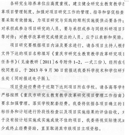 在此,对四位专家及其研究团队表示热烈的祝贺,也对长期以来积极支持研究生教育教学改革的各位申报专家表示诚挚的感谢。希望此次获批的重庆市研究生教育教学改革项目立足于新的研究视角和实践平台,积极探索新形势下研究生教育教学规律,不断培育研究生教育教学优秀成果,扎实推进研究生教育教学质量的提高。
