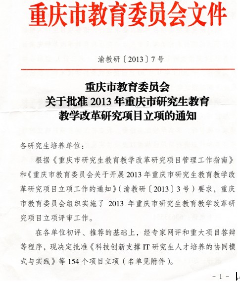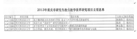 近日,重庆市教委向市内各研究生培养单位下发了《关于批准2013年重庆市研究生教育教学改革研究项目立项的通知》(渝教研〔2013〕7号)。其中,我校祝朝伟教授主持的“基于翻译能力培养的MTI学位,论文写作与评估模式探索研究”(项目编号:yjg133062);张涛教授主持的“英语专业“美国学”研究生的培养模式”(项目编号:yjg133064);林克勤教授主持的“多学科背景下文科院校研究生批判性思维模式的课程建构”(项目编号:yjg133069);杨全红教授主持的“以点带面,渐次改观:太阳成集团tyc122ccvipMTI课程教学改革探索与实践” (项目编号:yjg133075)获批2013年重庆市研究生教育教学改革研究项目。