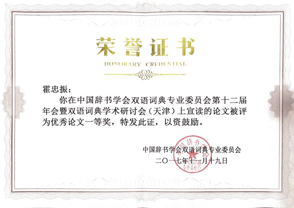 11月18日下午,大会采取全体与会者无记名投票和双语词典专业委员会常务理事会集中讨论的方式,推选出了10篇青年学者优秀论文,其中一等奖3篇,二等奖3篇,三等奖4篇。我校博士生马永强的论文“基于复杂适应系统语言观的现代汉语新词词化研究——以‘高大上’为例”和硕士生马宁、汪淑娴和霍忠振的论文“汉英词典中‘启发’的词类标注问题及对策——一项基于双层词类范畴化理论的研究”分别获得本次大会优秀论文评选一等奖。霍忠振同学还作为优秀论文一等奖获得者代表做大会发言。我校一次性囊括青年学者优秀论文奖3项一等奖中的2项,这无疑是对我校词典学人才培养质量的高度肯定。
