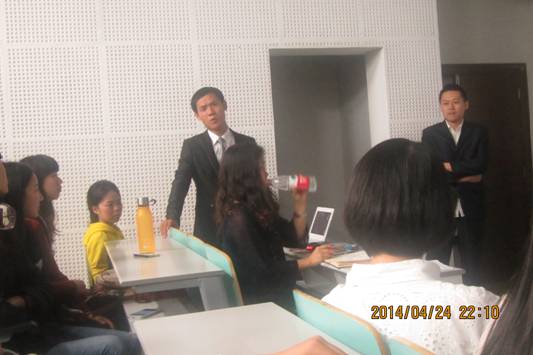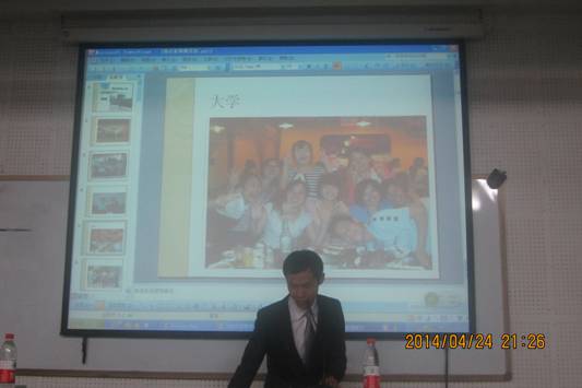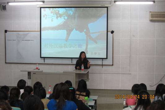 随后,为大家介绍经验的是我校2013届汉语言文字学专业毕业研究生吴让应。他以“我在泰国教汉语”为题,凭借风趣的语言,通过照片和视频的形式,向大家介绍了泰国人的善良、乐观。同时也展示了自己如何在教学中融入中国儒家文化,把两国文化和谐的融合在一起。随后,他还展示了自编教材和试卷,介绍了多种元素(如跳舞、画画、唱歌等)结合的教学方法,并坦言道学生给了自己无限的灵感,使自己更加热爱对外汉语教学这一职业。在接下来的提问环节,气氛异常活跃,听众们提出自己的疑惑,并得到了详尽的解答。最后,两位发言人鼓励大家为自己的梦想而努力前行。