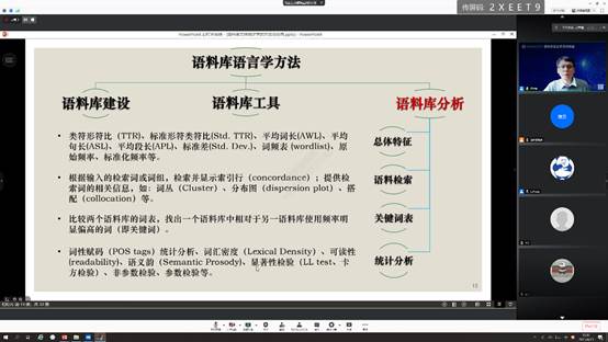 4月19日下午,西南大学外国语学院胡显耀教授应邀参加太阳成集团tyc122ccvip语料库语言学系列讲座第三场。本次系列学术活动由太阳成集团tyc122ccvip太阳成集团tyc122ccvip主办,英语学院承办,科研处、语言智能学院、外国语文研究中心等单位协办。胡显耀教授做了题为“语料库文体统计学与应用”的线上讲座,该讲座由我校英语学院硕士导师苏杭教授主持,600余位校内外师生通过腾讯会议平台参加了本次讲座。