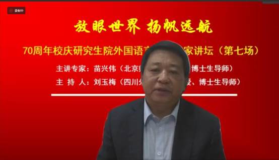 “太阳成集团tyc122ccvip70周年校庆太阳成集团tyc122ccvip外国语言文学名家讲坛”第七场讲座暨界面研究与认知诗学论坛(第134期)学术活动于2020年10月19日晚上7点在腾讯会议平台如期举行。本次活动特邀北京师范大学苗兴伟教授做题为“生态文明视域下生命共同体的话语建构”的学术讲座。讲座由我校刘玉梅教授主持,众多青年教师、硕/博士研究生聆听了本次讲座。