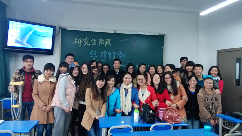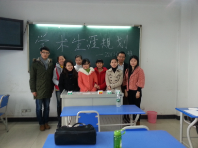 2013年12月5日,2013级12班在培英楼举行了“学术离我们有多远”暨“我的学术生涯”主题班会。在第一学期临近尾声之时,10名同学一起对自己这短短3个月的学术生涯进行了总结。班会上,各位同学都就自己的学习情况向大家进行了介绍。学习委员赵健哲同学首先进行了发言,强调了踏实积累学术的重要性;国际商务文化的孙海鑫同学从未来就业的角度跟同学们分享了求职心得;王虹、刘师言、付绪亚作为跨专业学生提出了基础知识补充的重要性。大家还就如何充分利用学校的学术资源与学术活动进行了热烈讨论,最后全班同学一起合影留念。这次班会让我们班每一位同学卸下了内心的疑虑,大家携手轻装上阵,定会在研究生路上走得更快、更稳、更好。