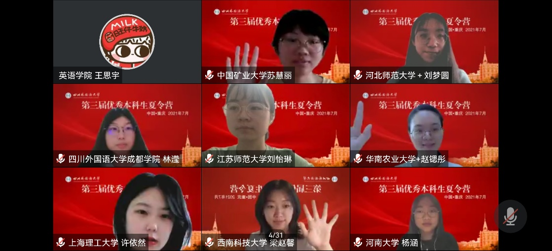 本届夏令营虽然受疫情影响由现场改为了线上,但仍然为营员们组织了丰富多彩的活动内容,搭建了一流的学习交流平台。两天的时间虽然短暂,但营员们却深切体验到了“川外”秉承“海纳百川,学贯中外”的校训,在70多年的办学历程中积淀形成了优良的学术氛围、宽广的学术视野、深厚的学术底蕴、真挚的师生情怀和优美的研学环境。营员们纷纷表示,将不负众望,加倍努力学习,期待明年金秋九月迈进川外的校门。