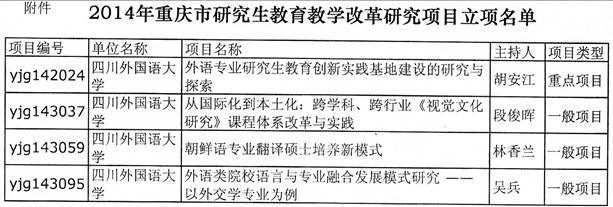 近日,重庆市教委向市内各研究生培养单位下发了《关于批准2014年重庆市研究生教育教学改革研究项目立项的通知》(渝教研〔2014〕5号)。我校胡安江教授主持的“外语专业研究生教育创新实践基地建设的研究与探索”(项目编号:yjg142024);段俊晖教授主持的“从国际化到本土化:跨学科、跨行业《视觉文化研究》课程体系改革与实践”(项目编号:yjg143037);吴兵副教授主持的“外语类院校语言与专业融合发展模式研究 ——以外交学专业为例”(项目编号:yjg143095);林香兰教授主持的“朝鲜语专业翻译硕士培养新模式” (项目编号:yjg143059)获批2013年重庆市研究生教育教学改革研究项目。其中胡安江教授主持的“外语专业研究生教育创新实践基地建设的研究与探索”为重庆市重点项目。