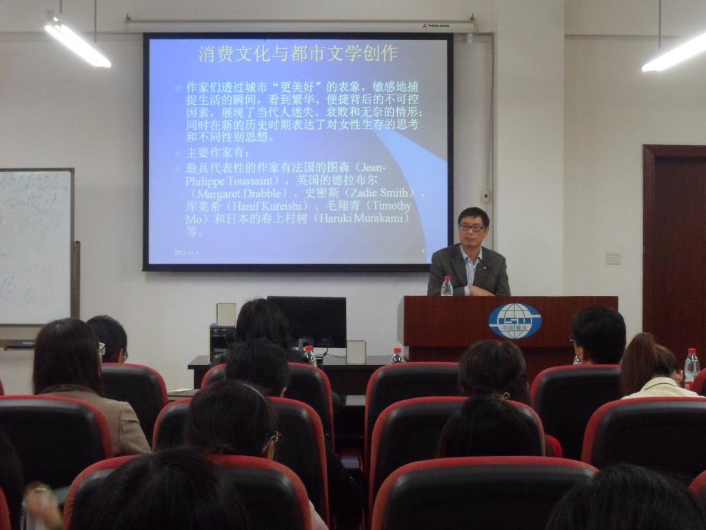 杨教授首先对新世纪文学发展趋势进行了简析,包括后现代主义文学,科技文明反思与生态文学,消费文化与都市文学,并列举了各种文学流派代表作家及其作品,着重介绍了后9.11文学的起源与发展,指出当代作家将“9.11”事件从一场悲剧转化为景观,在创作过程中巧妙地处理文学创作与民族文化的心理建构,与历史叙事,与意识形态等诸多关系、后9.11集文学思想与反思于一体,具化宽广的全球化意识。这些不同的文学主题以各自的方式继承后现代美学风格并开拓创新,其演绎的文学世界就是一个多彩的多元文化系统。