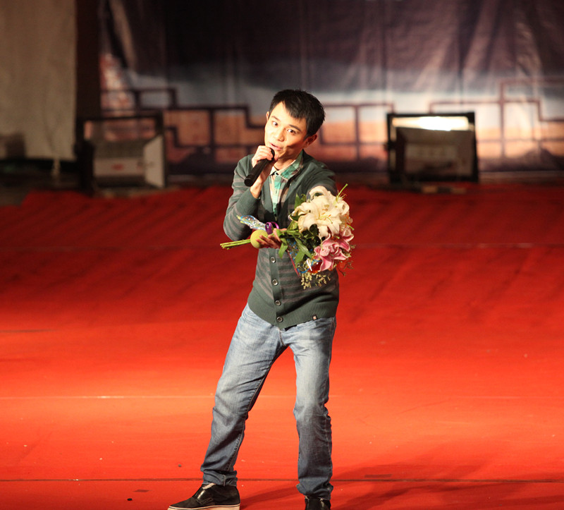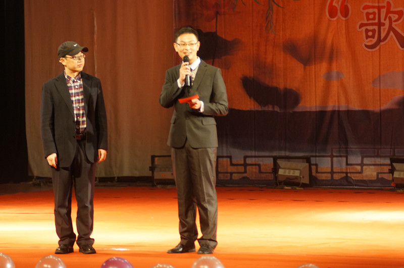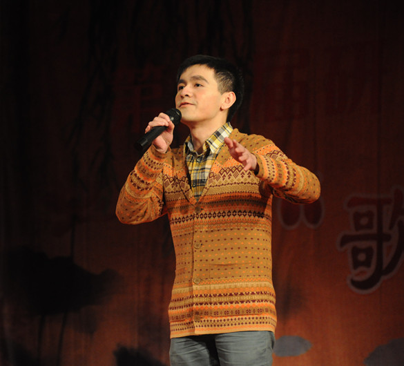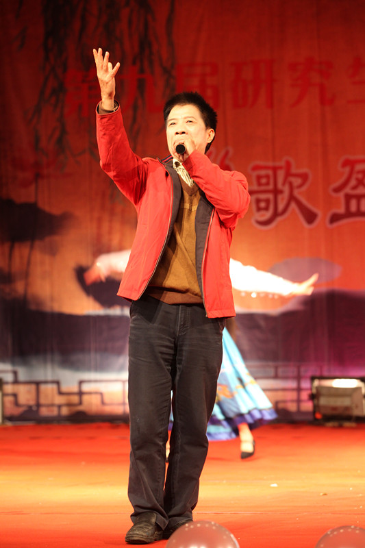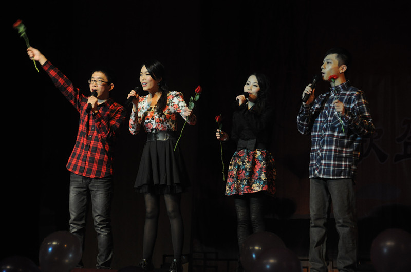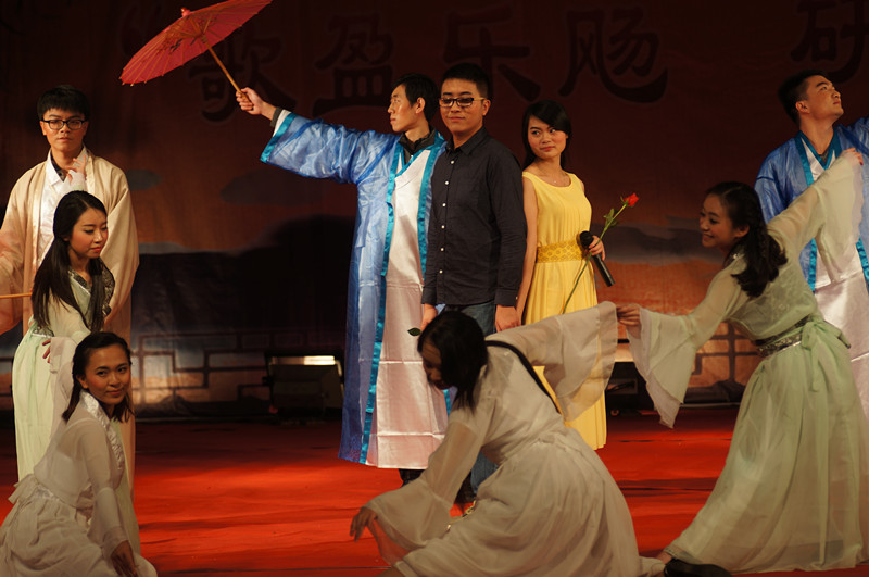 学校图书馆馆长何天云老师在这一篇章带来了经典曲目《天堂》,何老师声音高亢浑厚,饱含深情,将晚会推向了另一个高潮。何馆长与三名身着藏族服饰的女生载歌载舞,一曲听罢,同学们在现场微博墙互动中大呼,“何老师,再来一曲!”