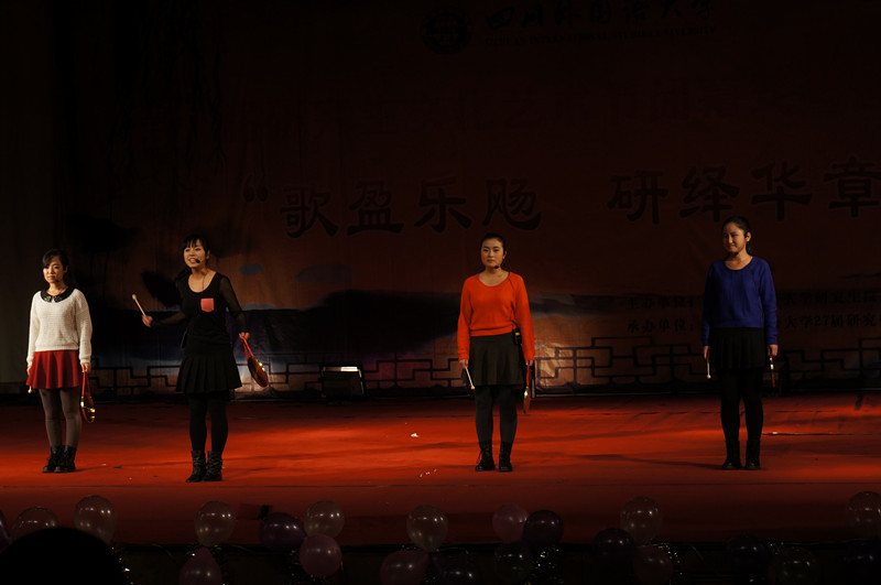 2013级7班的四位女生表演的三句半《川外印象》可说是晚会的一个特色节目,她们以诙谐的语言吐露出川外学子们的心声,幽默风趣,得到大家的频频称赞和阵阵掌声。