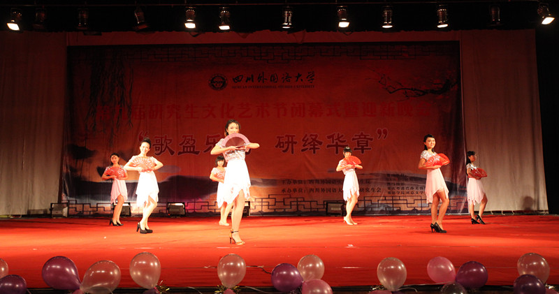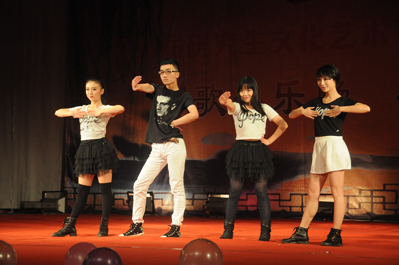 紧接着是由2012级廖宇思、姚沁、杨骥、王涵四位同学带来的热舞《Bad Girl Good Girl》,演员们妙曼的舞姿让晚会现场迅速升温,现场掌声不断。