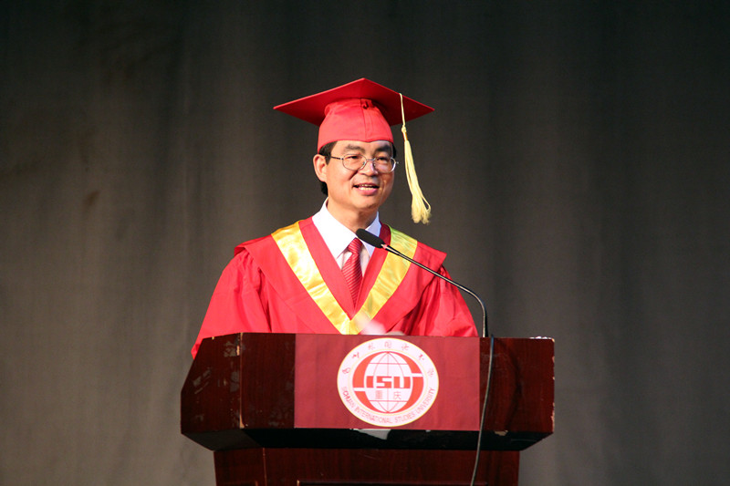 接着,研究生指导教师代表周文德教授发言。他首先向在场的同学、家长和领导表达了问候。他告诫同学们,社会不同于学校,大家需要用一辈子去学习和琢磨。一句“社会的路比川外的观云梯还要陡峭,绝不会像夺命坡和彩云梯那样轻松”,令在场观众笑声连连,掌声不断。他希望同学们勤动脑,多思考,不骄傲,不自卑,勇于面对生活。无论在什么样的岗位,都不要放弃曾经拥有的梦想。