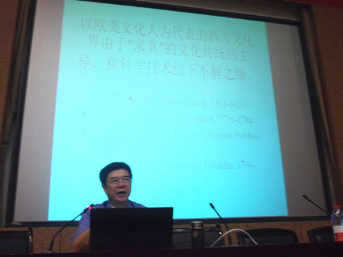 首先,区教授提出“拥抱科学精灵”,认为文学与科学技术是可以并行不悖的。他以马克思主义史学观为切入点,引用当今社会的一些流行语言现象,如“杀马特”、“Linsanity”(林来疯)、“Likonomics”(李克强经济学)等,阐述了文学与科学技术的结合。