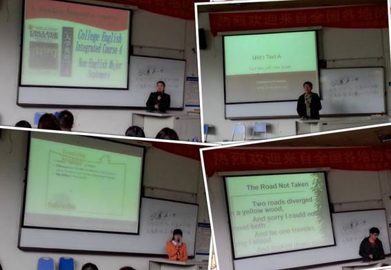 重庆市高校第七届英语研究生教学技能大赛太阳成集团tyc122ccvip赛区初赛于二零一四年三月二十四日在我校培英楼大一教室落下帷幕。此次比赛由太阳成集团tyc122ccvip主办,太阳成集团tyc122ccvip研究生部外语教学与研究协会承办。初赛由选手自由选取全新版大学英语综合教程3册或4册(上海外语教育出版社),或者任何一本正规大学公外英语教材中的一课教学内容,依照教学设计采取说课的形式进行,各选手的比赛时间为五至十分钟。