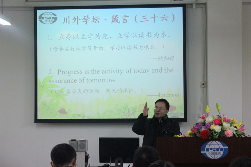 首先,2013级研究生曹颖同学向全体师生分享了本次学坛的两则箴言:“立身以立学为先,立学以读书为本。——欧阳修”及“Progress is the activity of today and the assurance of tomorrow. ——Emerson”。