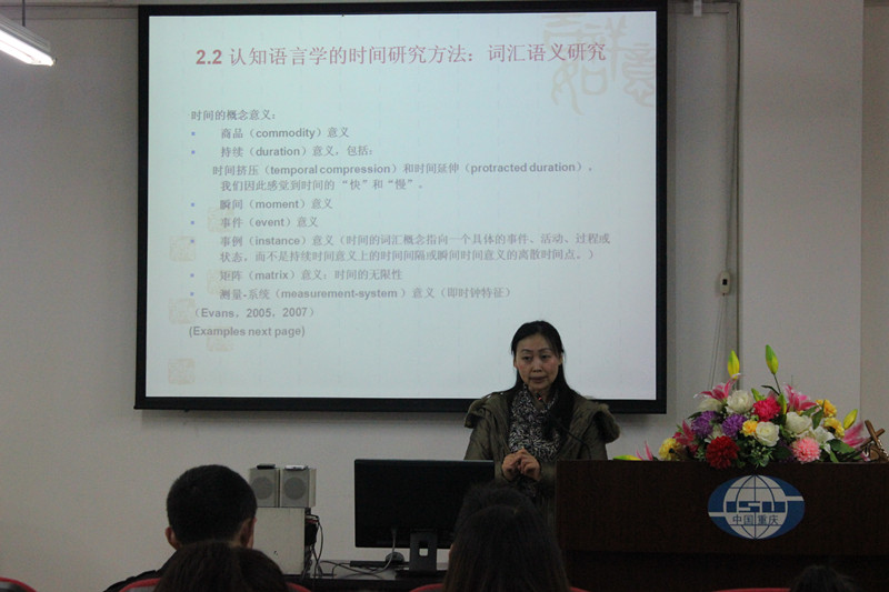 2014年3月6日晚7:00,川外学坛“学术大视野”教师讲堂在博文楼六楼会议室如期举行。此次活动邀请到重庆师范大学肖燕教授做题为“时间认知中的空间隐喻”的学术讲座。讲座由姜孟教授主持,国际关系学院张庆博士等3名老师以及各年级研究生参加讲座。