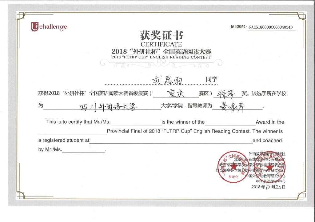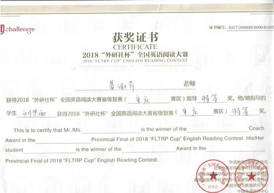 阅读大赛复赛分为四个板块:Read and Know(读以明己);Read and Reason(读以察世);Read and Question(读以启思);Read and Create(读以言志)。旨在培养学生的思辨能力、表达能力、创新能力和综合素养,展现英语学习成果和英语运用能力。比赛采取网上作答的形式,评分方式采用iTEST大学外语测试与训练系统和专业老师人工阅卷相结合的方式。最终,凭借出色的语言能力,沉着冷静的应答,我院刘思雨同学在姜淑芹老师的指导下,获得了阅读大赛重庆赛区特等奖,成功晋级全国总决赛,将代表我校和重庆赛区于12月份赴京与来自全国各个省份的学子进行角逐。