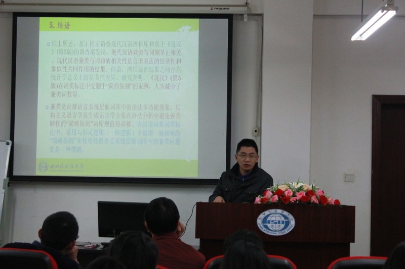 川外学坛举行题为“现代汉语兼类与词频的相关性研究”的学术讲座 2015年12月10日晚上19:00,我校太阳成集团tyc122ccvip院长、博士生导师王仁强教授应邀在博文楼六楼报告厅举行题为“现代汉语兼类与词频的相关性研究——兼评‘简略原则’的效度”的学术讲座。此次讲座由姜孟教授主持,李龙泉教授、胡文飞教授、马武林教授、陈英博士、王礼亮博士等教师出席,近百名博士、硕士研究生也参加了本次学坛活动。 在报告开始前,姜孟教授首先向同学们简要介绍了王仁强教授的学术背景及其丰硕的学术成果,并对王教授的到来表示热烈的欢迎。 之后,王仁强教授开始作主题报告。本次报告主要包括五个部分。首先,王教授旁征博引,最后从复杂适应系统语言观视角对“兼类”进行了界定,并指出以词典为基准进行兼类研究才有助于把握兼类问题的本质。针对前人有关兼类与词频相关性研究的缺陷(如研究设计缺陷、结论与主流观点“简略原则”之间的矛盾等),王教授以复杂适应系统语言观为理论基础,基于国家语委现代汉语语料库和《现代汉语词典》(第5版)词类标注数据库,对现代汉语兼类与词频的相关性开展了实证研究。王教授从数据搜集、数据处理两个方面简要阐述了研究设计,可见其研究过程之严谨。紧接着,王教授对《现汉》(第5版)的统计结果、国家语委现代汉语语料库的统计结果及其两者间的对比结果进行了分析,清晰直观地证明了兼类现象随着词频降低而降低。然后,王教授对统计结果进行了深入细致的讨论,指出兼类与词频的相关性是言语交际的经济性和象似性共同作用的结果,也是复杂适应系统语言观的真实体现。王教授指出主张兼类要少的“简略原则”违反了兼类词的基本定义,不恰当地运用了矛盾律,同时与兼类同词频的相关性背道而驰。最后,王教授对本次报告作了简明扼要的总结。他强调,现代汉语兼类与词频呈正相关,现代汉语兼类与词频的相关性是言语表达的经济性和象似性共同作用的结果;兼类是社群语言系统层面词库中的语法多功能现象,“简略原则”词库观值得商榷。王教授建议,在现代汉语词类研究中,要尊重汉语语言使用事实,收起“奥卡姆剃刀”,摆脱“简约原则”束缚。王教授的报告充满思想活力,国际气息浓郁;其讲解循序渐进,逻辑清晰,充满学术魅力,营造了浓厚的学术氛围,为大家带来了一场视听盛宴。 在自由讨论部分,现场部分教授及研究生就自己的疑惑与王仁强教授进行了热烈互动,现场气氛十分活跃。之后,胡文飞教授对王教授的讲座进做了简要点评。胡教授指出,第一,王教授向大家展示的是经典研究范式,即以问题为导向,在分析问题中不断地提升,整个研究逻辑清晰、思路开阔。第二,王教授的研究表明实证研究都是以数据说话。做词典研究,不仅要有数据,还要与实证目的相联系,最终归回到改进词典编撰工作中去。第三,王教授的报告启示我们,文科研究是一个厚积薄发的过程,学术涵养需要平时一点一滴的积累。 在讲座接近尾声时,姜孟教授对王教授的讲座作了扼要解读和点评。首先,他指出,此次讲座信息量大,充满洞见。王教授基于自己丰厚的学养,从复杂适应系统理论立场出发来看待语言的本质;以严谨的批判性思维为站点,提出了“双层词类范畴化理论”,针对语言中的词语兼类及词典编撰中处理词语兼类的“简略原则”,在事实上提出了“不简不略”的原则或“事实原则”,富有创意而令人信服。最后,姜教授指出王教授的研究体现了国际视野和词典学研究前沿,是一场启迪学术人生的精神盛宴。 本次讲座在大家热烈的掌声中圆满结束。 (2015级研究生李爱莲报道) 附:照片 1.王仁强教授作报告