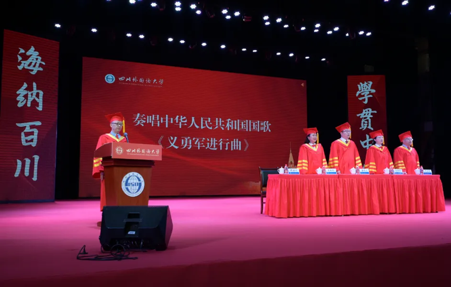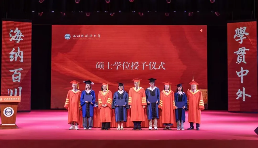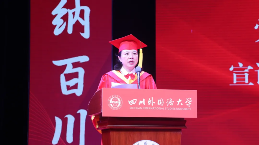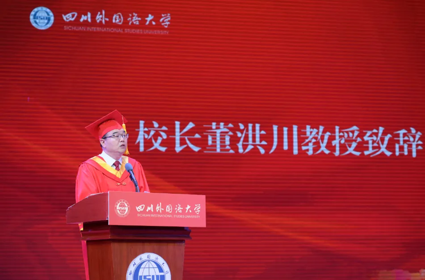 校长董洪川向2024届研究生毕业生致以热烈的祝贺,并对同学们在川外取得的优异成绩和不懈努力表示了肯定。他指出,在川外这所学术殿堂里,同学们不仅学到了各自领域的专业知识以及精益求精的学术思维,而且参与并见证了学校的发展与进步。在毕业生即将奔赴远方之际,他向毕业生提出三个期望:第一,要崇德向善、知行合一,继续践行“海纳百川,学贯中外”的川外校训,在实践中悟真知、求真理、长真才;第二,要心怀天下、与时俱进,以川外学子得天独厚的语言优势和跨文化沟通能力,做中国故事的讲述者、中国声音的传播者,展现新担当、实现新作为;第三,要守正创新、锐意进取,牢记习近平总书记强调的创新精神,努力成为具有深厚民族精神和家国情怀的高水平、创新型国际化人才。他勉励全体毕业生“以青春为笔,以梦想为墨,绘就人生的壮丽画卷;怀揣赤子之心,勇担时代使命,为跨文化交流添砖加瓦,把中华文化推向世界,为实现中华民族的伟大复兴贡献青春力量”。