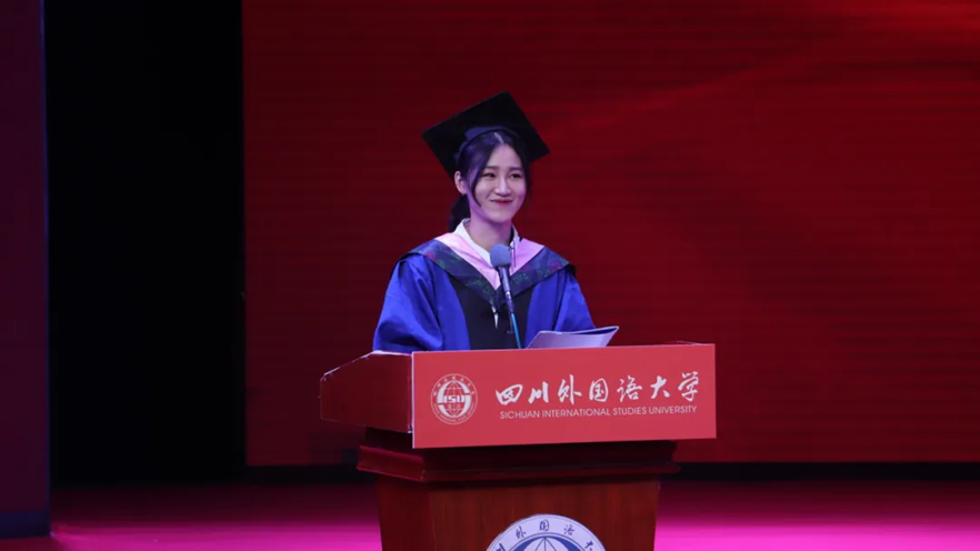 英语学院博士研究生谭小勇同学、东方语言文化学院硕士研究生孙晓妍同学、俄语学院硕士研究生金淑贤同学(吉尔吉斯斯坦)先后发言。在发言中,三位学子均表示 “海纳百川,学贯中外”的校训、优良的学风,浇灌了川外学子的学识,淬炼了思想,凝固了身为川外人的信仰。未来,川外学子将始终传承“团结、勤奋、严谨、求实”的校风,将历代川外人积累的精神财富作为指引我们前行的明灯,努力推动知识的传播与创新,化解文化和语言的隔阂,建立沟通与理解的桥梁,将自我价值融入国家和社会发展的洪流之中。继承母校的优秀传统,为国家和民族的振兴贡献自我的青春力量。