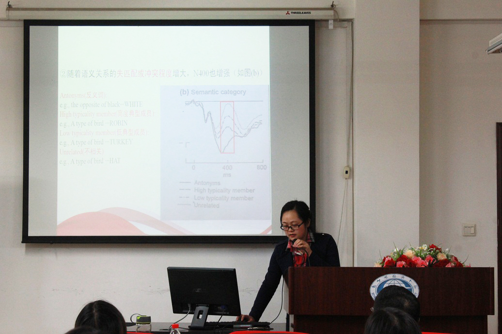 接下来,丁玲同学和段继香同学与大家分享了她们最近的读书与研究心得。本次报告主要包括三部分。在第一部分,丁玲同学从ERPs(事件相关电位)的原理与提取、ERPs的主要特征以及ERPs技术的优势三个方面对事件相关电位作了精要的介绍。在第二部分,丁玲同学详述了ERPs成分N200。首先,她从研究范式及成分特点两方面对N200作了简要介绍。她指出,N200对视觉领域呈现的清晰刺激极为敏感,不受被试反应方式和外在干扰信息影响,且其波形变化主要位于大脑枕叶区域。接着,丁玲同学结合前人实证研究从语音、视觉词形、句法、信息编码、情感加工、加工新异刺激的努力程度六个方面,详述了N200反映的加工内涵。然后,她还介绍了PMN(语音失匹配负波),MMN(失匹配负波)等N200的子成分。最后,丁玲同学对N200的特点及加工内涵作了总结。在报告的最后一部分,段继香同学主要阐述了ERPs成分N400。首先,她从基本概念、成分特性、影响因素三个方面对N400作了简要介绍。紧接着,她又从N400的发现、早期和成熟阶段所开展的研究介绍了N400的相关研究历程。接下来,段继香同学介绍了N400的主要研究范式,包括句尾歧义词、相关词与无关词、词与非词、新词与旧词和图片命名等。然后,她结合以往的实证研究详述了N400反映的三大加工内涵,即语义加工、音乐语义加工以及工作记忆负荷。最后,她对N400的特点和反映的加工内涵作了简明扼要的总结。两位同学的报告结构清晰、逻辑谨严、内容详实、重点突出,使大家对N200和N400这两个脑电成分有了更加深刻地认识。