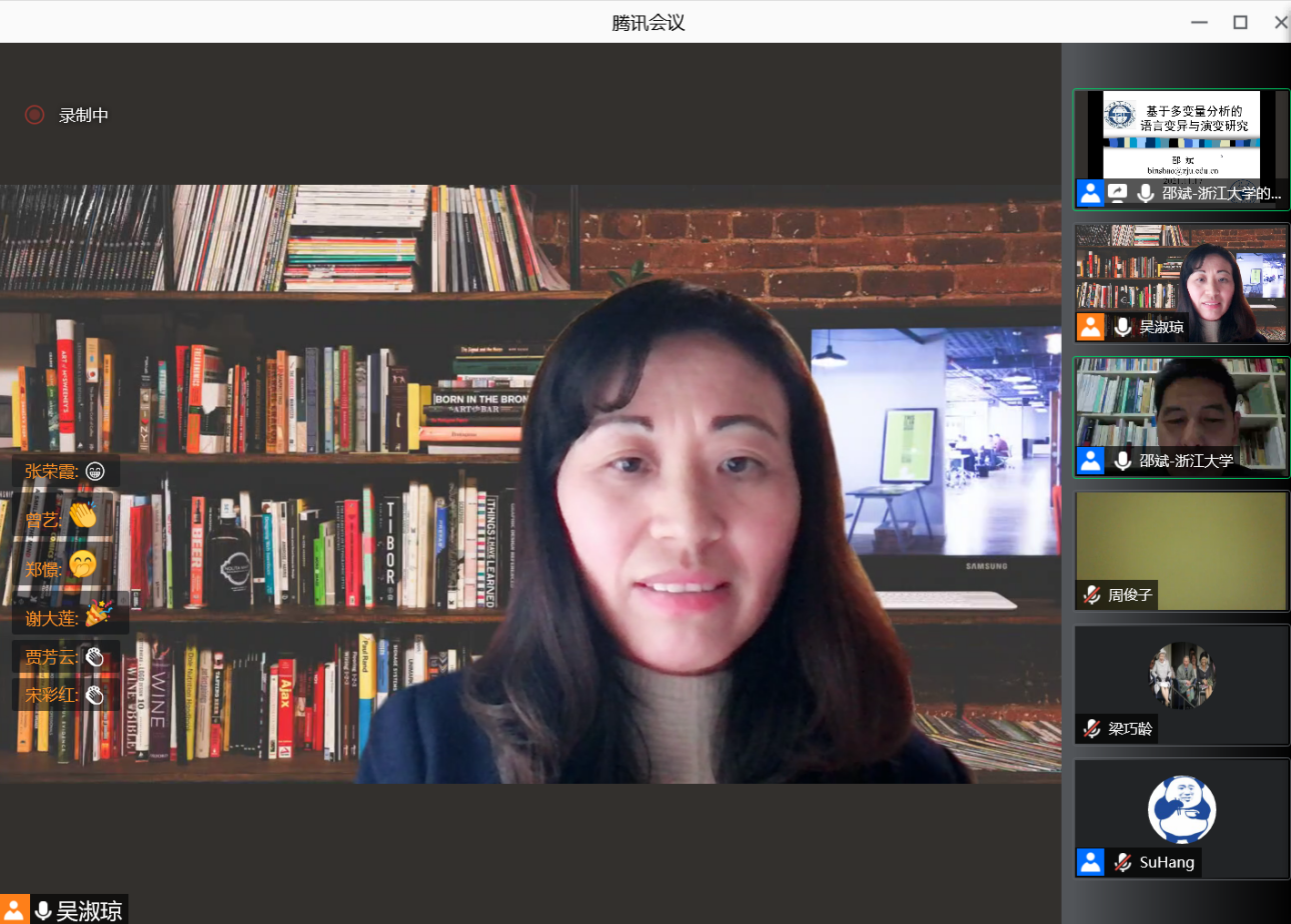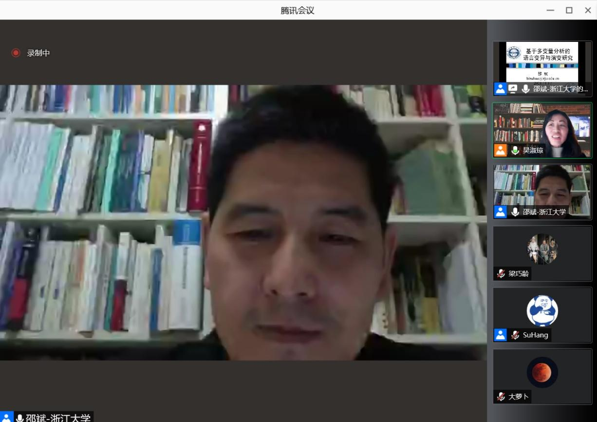 太阳成集团tyc122ccvip太阳成集团tyc122ccvip界面研究与认知诗学论坛(第145期)学术活动于2021年11月17日晚七点在腾讯会议平台如期举行。本次活动特邀浙江大学博士生导师邵斌教授做题为“基于多变量分析的语言变异和演变研究”的学术讲座。讲座由我校英语学院博士生导师吴淑琼教授主持,刘兴兵教授、苏杭教授等校内外师生共计200余人聆听了本次讲座。
