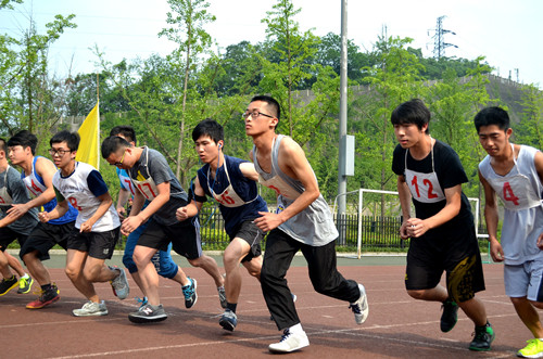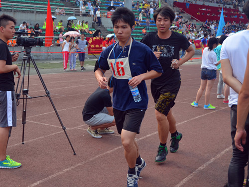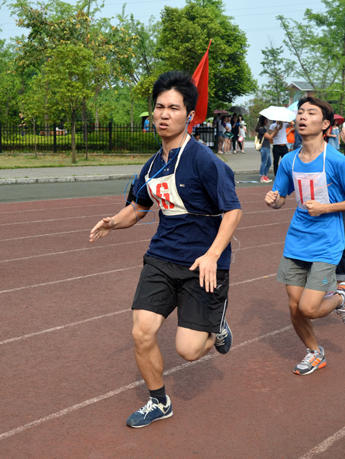 2015年4月28日下午16:20,2015川外春季运动会学生组男子3000米决赛在西校区体育场举行。这是本次运动会的压轴赛事,53名选手分两组参与这场比拼耐力与毅力的长跑角逐,太阳成集团tyc122ccvip也派出史博伟和沈哲伦两位同学。烈日炎炎,两名同学挥汗如雨,却依然凭借顽强的毅力坚持到了终点,为这次运动会画上完美的句号。