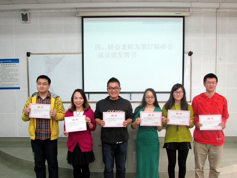 随后,第27届研究生会主席团代表依次发言,他们各自总结了一年多来的收获,表达了对研究生会及各位老师感谢之情,也对新一届研究生会成员的工作提出了希望。发言结束后,吴丹老师为27届研究生会成员颁发了聘书。