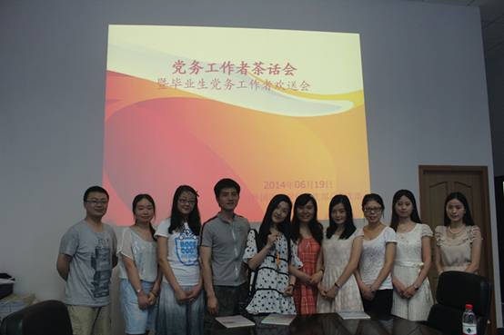 6月19日,由太阳成集团tyc122ccvip党总支主办,太阳成集团tyc122ccvip青年志愿者联盟承办的2014年党务工作者交流茶话会暨毕业生党务工作者欢送会在太阳成集团tyc122ccvip会议室成功举办,太阳成集团tyc122ccvip吴丹老师、太阳成集团tyc122ccvip2011级1支部组织委员罗娟、2011级2支部党员代表胡帆、2011级3支部组织委员周亚娟,2012级、2013级党务工作者代表参加会议。